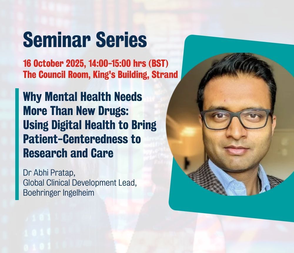 We were thrilled to welcome Dr Abhi Pratap - Global Clinical Development Lead at Boehringer Ingelheim who delivered our October Seminar Series. In his talk “Why Mental Health Needs More Than New Drugs: Using Digital Health to Bring Patient-Centredness to Research and Care" , Abhi shared case examples from emerging clinical studies to show how digital health can bridge the gap between clinical research and patient care in mental health. We will explore digital health solutions that help quantify the real-world experiences of health that matter to people - bringing us closer to understanding what treatments work for whom, why, when, and for how long. Abstract: Innovation in mental health treatment has been strikingly limited compared to other fields of medicine. In the last 15 years, fewer than five truly novel psychiatric drugs have received regulatory approval. This stagnation reflects multifaceted challenges linked to heterogeneity of psychiatric disorders often lacking biological markers grounded in disease biology. Additionally, there is significant reliance on subjective clinician-, rater-, or patient-reported outcomes, which increases variability in trial outcomes and poses challenges in patient selection and endpoint determination. Clinical studies also encounter persistent obstacles, such as high dropout rates, poor generalizability, and endpoints that frequently do not reflect what patients and their families value most. Consequently, there is a critical gap in new treatment development that are patient-centered, enhancing quality of life in real-world settings. Use-case-centered implementation of digital health technologies offers a realistic path to address many of these barriers. Real-world data collected from smart devices can enable the continuous and ecologically valid capture of mood, cognition, behavior, and functioning, augmenting traditional, episodic assessments. This richer measurement framework can enhance sensitivity to change, reduce trial inefficiencies, and ground outcomes more directly in patients lived experience. In addition, the same smart devices can be used to deliver digital adaptations of psychosocial interventions, expanding access to evidence-based care and offering personalized and scalable options for populations that have been historically underserved due to stigma, geography, or cost. Dr. Abhi Pratap is the Global Clinical Development Lead at Boehringer Ingelheim, where he oversees clinical development programs for digital therapeutics aimed at addressing unmet needs in serious mental illnesses. Before joining Boehringer, he worked at Biogen, managing one of the largest decentralised studies on cognitive trajectories in real-world settings in collaboration with Apple. With over 15 years of experience in translational biomedical research, Dr. Pratap has led numerous health research studies that promote partnerships between academia and industry. His primary focus is on using digital health technologies to gain a deeper understanding of the real-life experiences of individuals with neurological and psychiatric disorders. His cross-sector research aims to accelerate patient-centered clinical development in central nervous system (CNS) disorders. Most recently, he led a successful pivotal Phase III trial targeting experiential negative symptoms of schizophrenia (NCT05838625) using a digital therapeutic. This study is among the first confirmatory trials to show improvement in negative symptoms to date. Additionally, Dr. Pratap serves as an adjunct faculty member at the University of Washington in Seattle and Boston University, and he is a visiting research fellow at King’s College London.